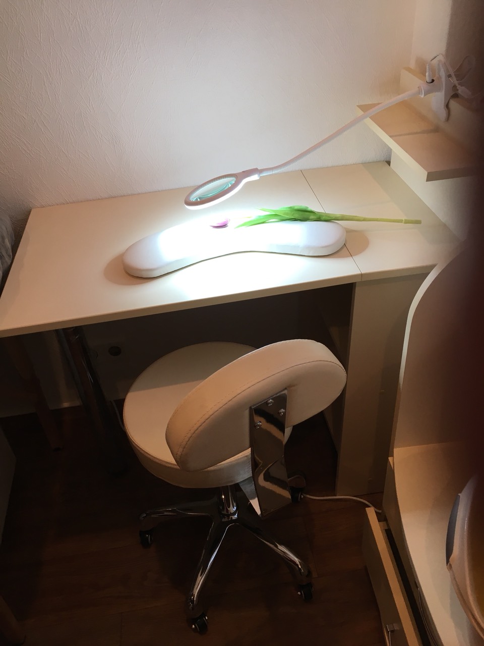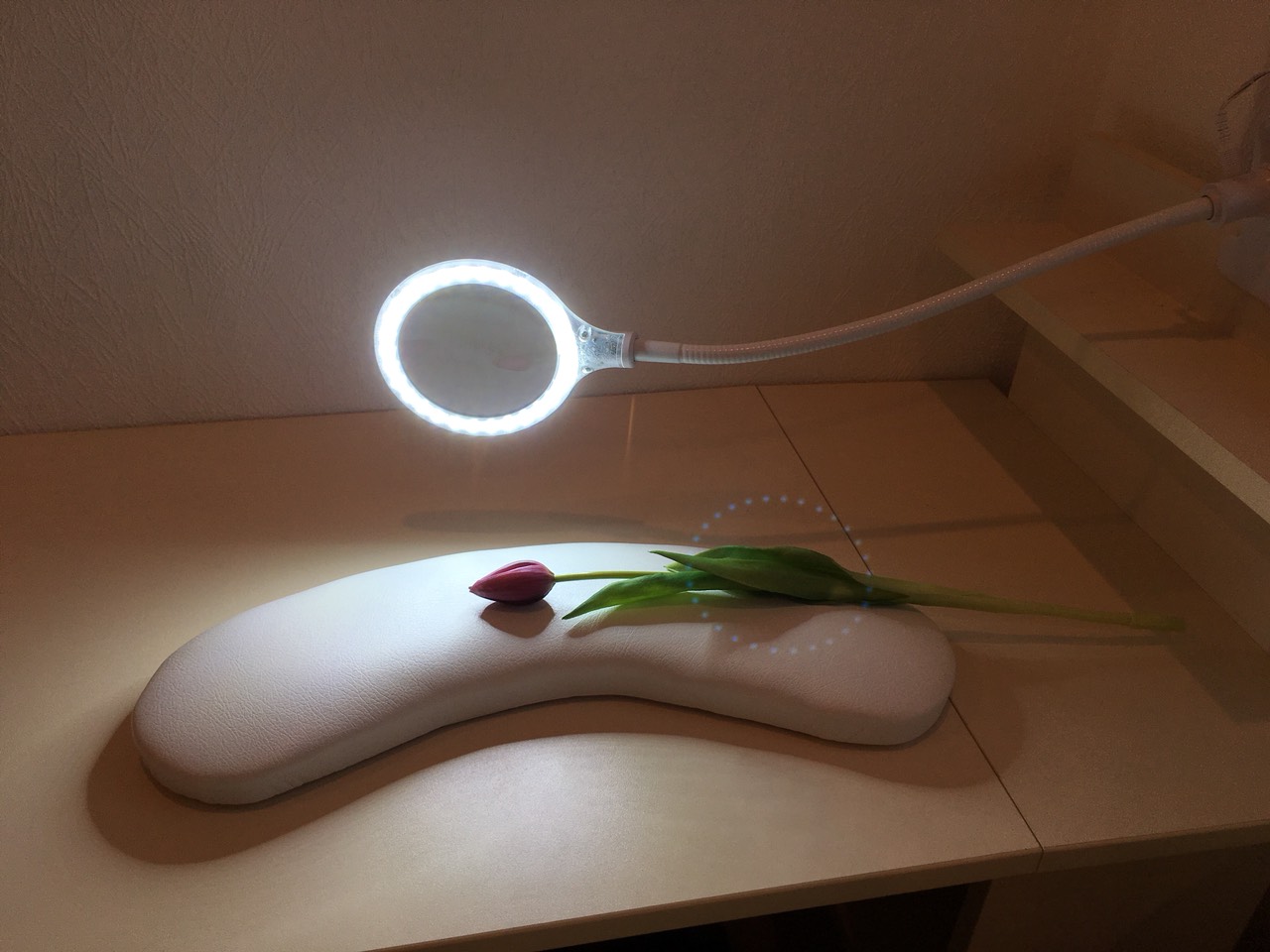 Очень компактная лампа имеет тонкий корпус, гибкий механизм регулировки расстояния и поворота, В комплекте идёт прищепка с помощью которой лампа крепится к поверхности, либо же подставка, с помощью которой лампу можно поставить на стол.