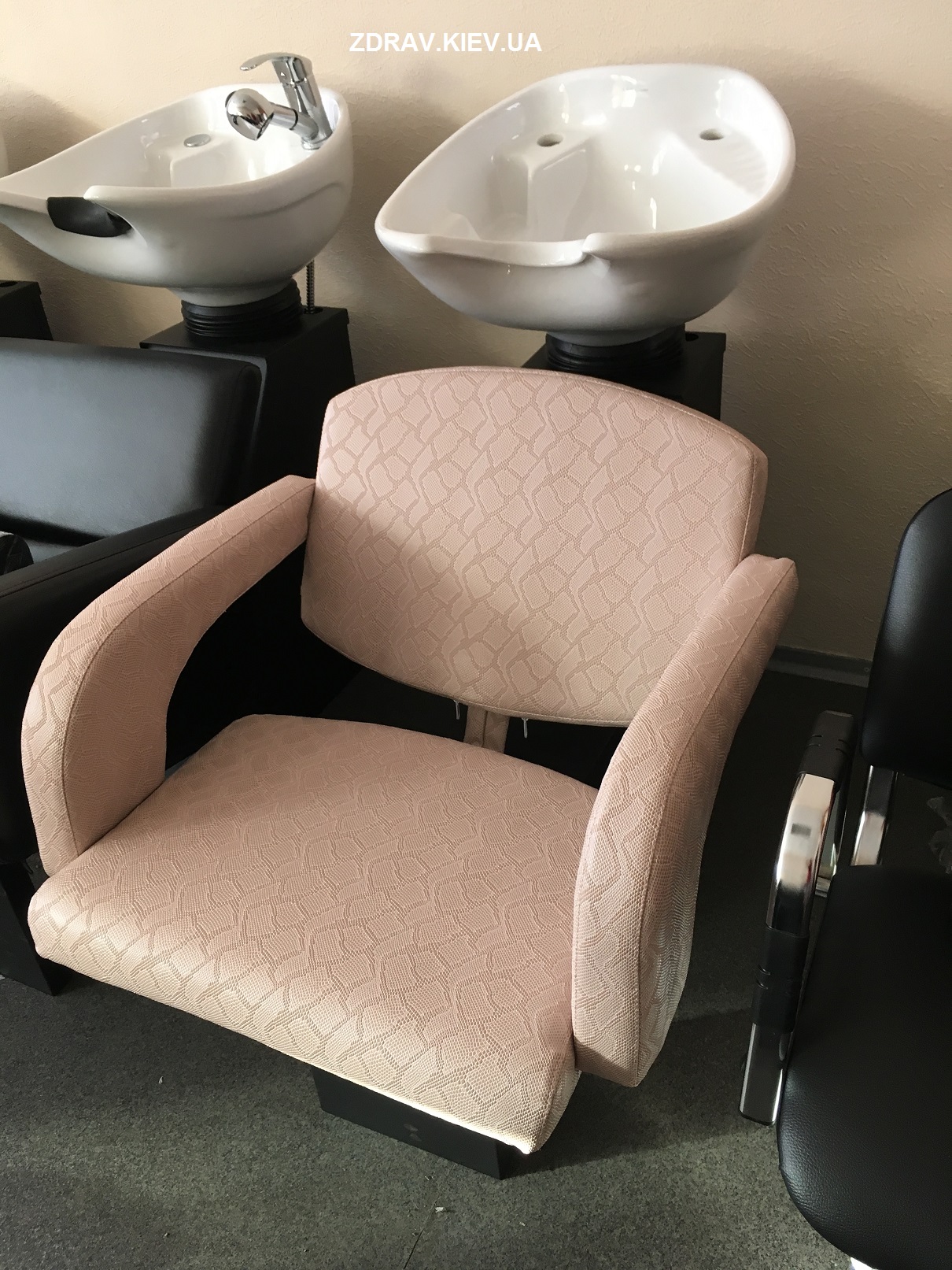 а металевим з'єднанням по центру, який обтягнутий тим же шкірзамінником. Крісла до мийки робляться напівлежачими для зручності клієнтам,